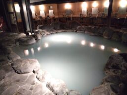 日帰り客がいない静かな時間帯に、広々としたお風呂を独り占めできるのは最高の贅沢。硫黄泉の白濁したお湯と香りを心ゆくまで堪能できます。